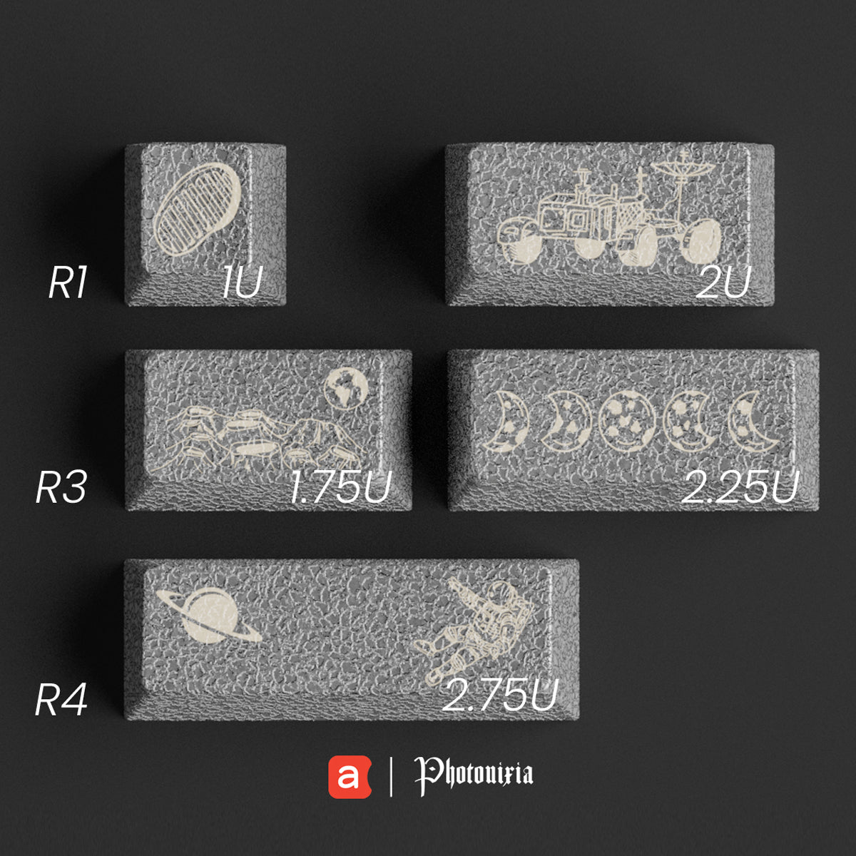 月をテーマにしたキーキャップ セットには、人類の月探査を表す 5 つの象徴的なデザイン (月の足跡、月面探査車、月のクレーター、宇宙遊泳、月の満ち欠け) を特徴とする 5 つの斬新なアドオン キーが含まれています。これは、月への旅の素晴らしい物語とマイルストーンを毎日思い出させるものであり、単なる機能的なアクセサリではなく、発見の精神へのオマージュでもあります。