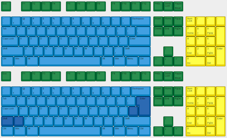 표준 레이아웃 (ANSI 또는 ISO 등)은 일반적으로 문자와 수정자에 1u를 사용하지만 Shift(2.25u/2.75u) , Spacebar(6.25u 또는 7u) , Enter(L자 모양 또는 1.25u) 와 같은 더 큰 키는 다양합니다.